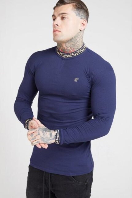 Long Sleeve Chain Rib Collar Cuff Polo – Navy