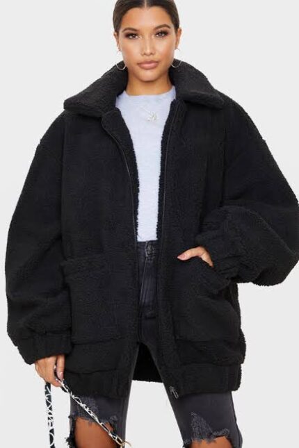 Black Oversized Borg Pocket Front Coat
