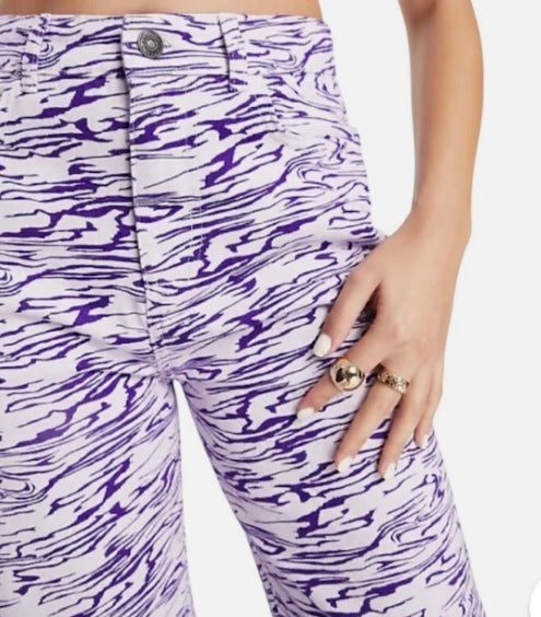 A statement denim piece featuring a bold, multicoloured animal pattern, often described as a lavender or lilac-toned zebra design. These jeans typically offer a high-rise, relaxed “dad” fit that is slouchy and roomy through the hip and thigh, often made from durable denim, sometimes featuring a polyester blend.