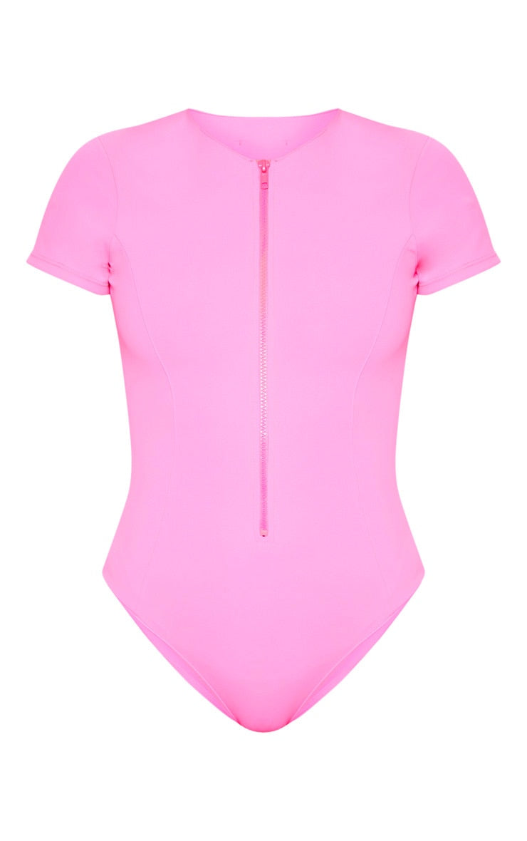 - Get maxing out your holiday look with this swimsuit, featuring a hot pink scuba material with a zip up front design. We love this styled with some killer shades for ultimate glam this season.