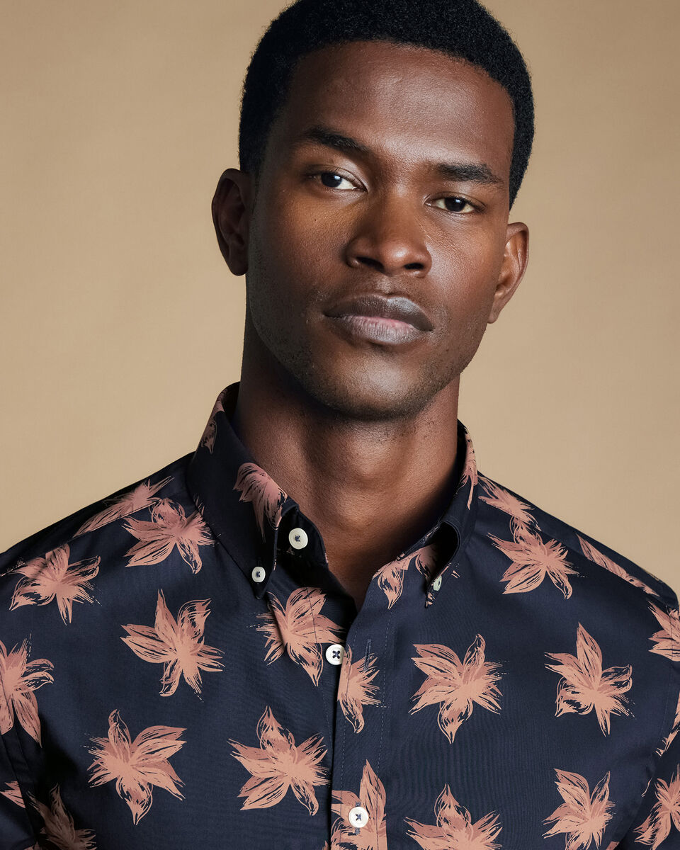 Non-Iron Large Floral Print Classic Fit Short Sleeve Shirt – Navy