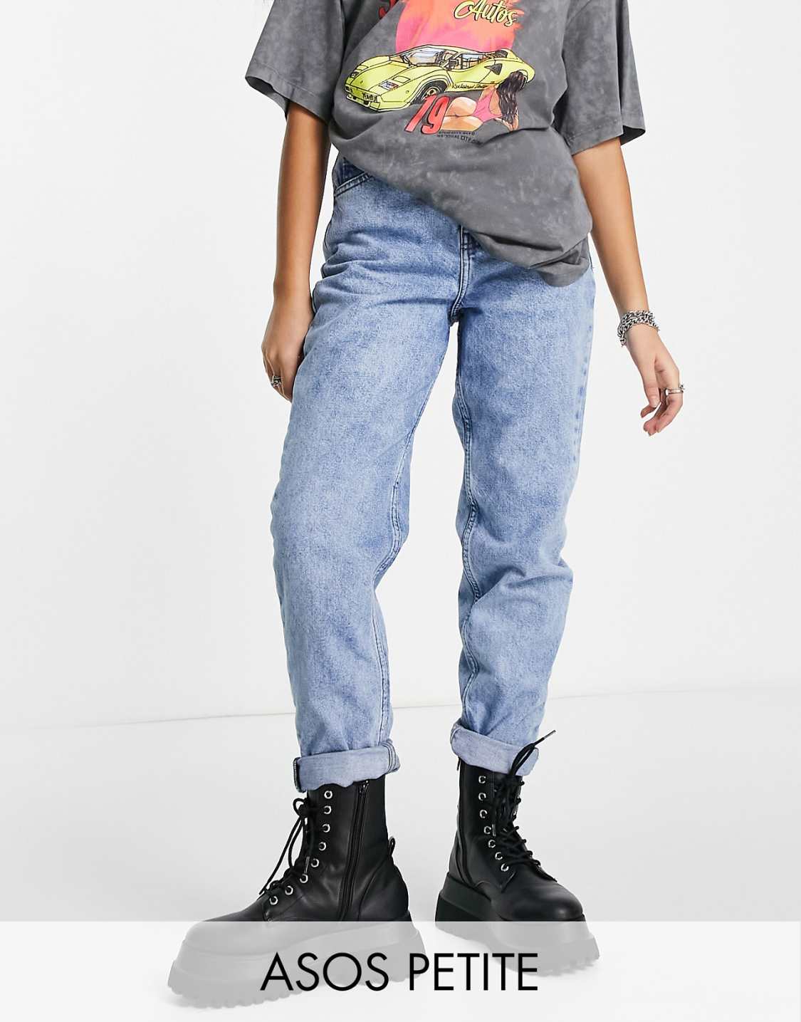 Petite jeans by ASOS DESIGN High rise Belt loops Five pockets Cropped length Relaxed mom fit